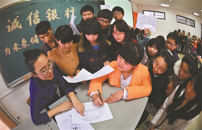2月27日,天津師范大學數學科學學院同學們身邊出現了一家特殊的『銀行』,它不能存錢取錢貸款,不能透支轉賬匯款,但能『存取』誠信,因為這是一家『誠信銀行』。當天下午3點,師大『「誠信銀行」——為未來儲蓄為夢想加油』主題活動啟動儀式舉行,標志著『誠信銀行』的啟動,768名大學生加入『誠信銀行』,承諾遵守誠實守信的價值准則。