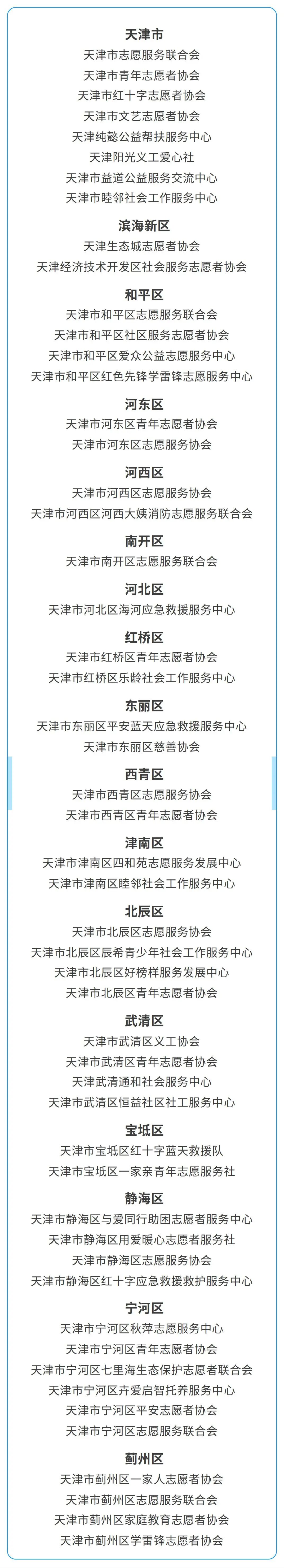 為深入貫徹落實《中共中央辦公廳 國務院辦公廳關於健全新時代志願服務體系的意見》要求,深化志願服務領域突出問題專項整治工作,進一步加強志願服務監督管理,提昇志願服務規范化、專業化水平,為廣大群眾特別是青少年參與志願服務提供渠道和機會,現公布天津市首批52個(含8個市級和44個區級)志願服務組織“白名單”並動態更新。